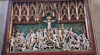Click on the image to listen to the Stations The image is from the reredos in St. Stephen's Chapel in York Minster: "The First Hour of the Crucifixion" If you look closely at the content there are some interesting and quirky features |